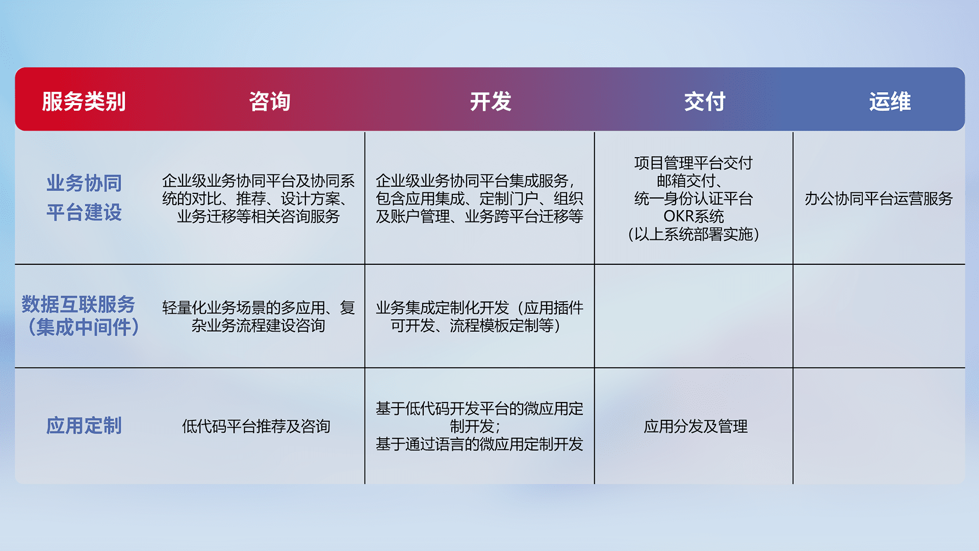 针对钉钉、、企微、、、、IDaas等平台级产品提供产品的规划、、方案、、、、交付、、定制化开发等服务,,实现如统一协同办公、、智能客户服务、、、、混合会议管理、、、智能数据查询、、等业务场景,,,实现数字化转型。。