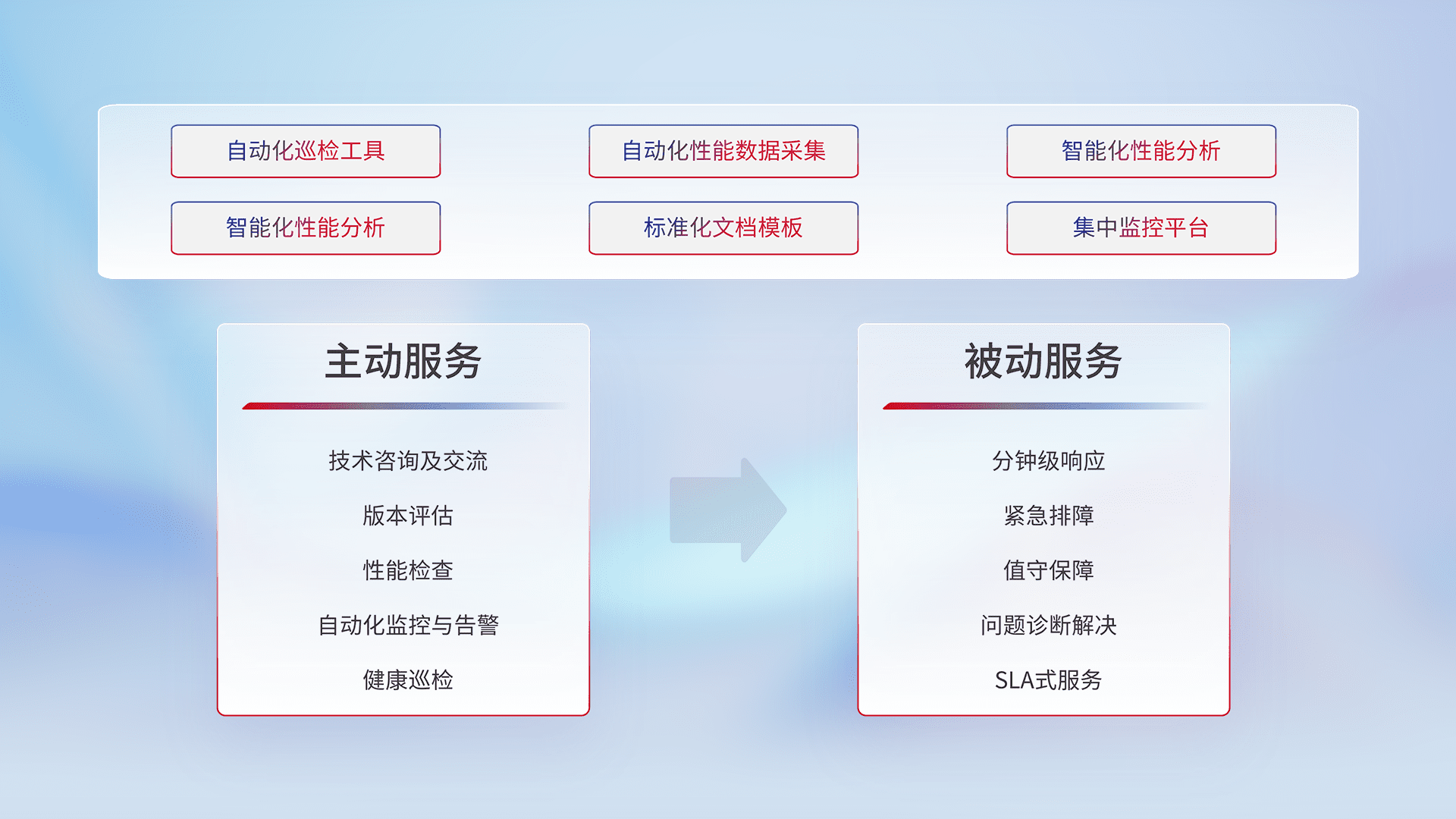 智能化工具和标准化文档,,保障服务质量,,提供主动服务(包含技术咨询、、版本评估、、、、性能检查、、、自动化监控与告警、、健康巡检)和被动服务包含(分钟级响应、、紧急排障、、、、值守保障、、问题诊断解决、、SLA服务)。。。
